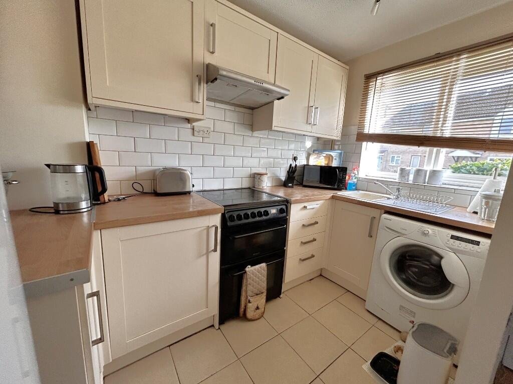 Fitted with matching cream shaker style wall and base units with teak effect worktops over. Inset stainless steel sink and drainer with mixer tap. Hotpoint electric cooker. Space for fridge/freezer and washing machine. Window to front aspect.