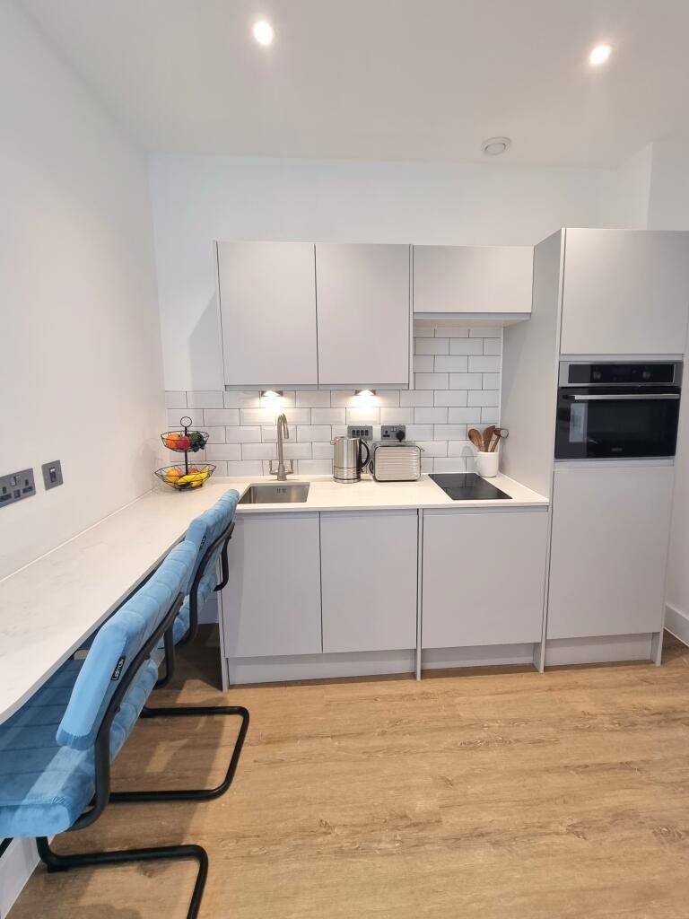 This modern open-plan studio apartment includes integrated white goods in a fully equipped kitchenette with solid stone worktops and a