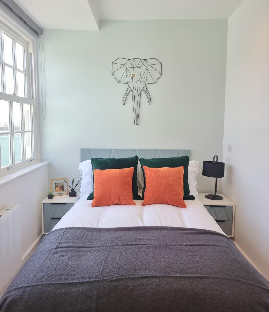 This modern open-plan studio apartment includes integrated white goods in a fully equipped kitchenette with solid stone worktops and