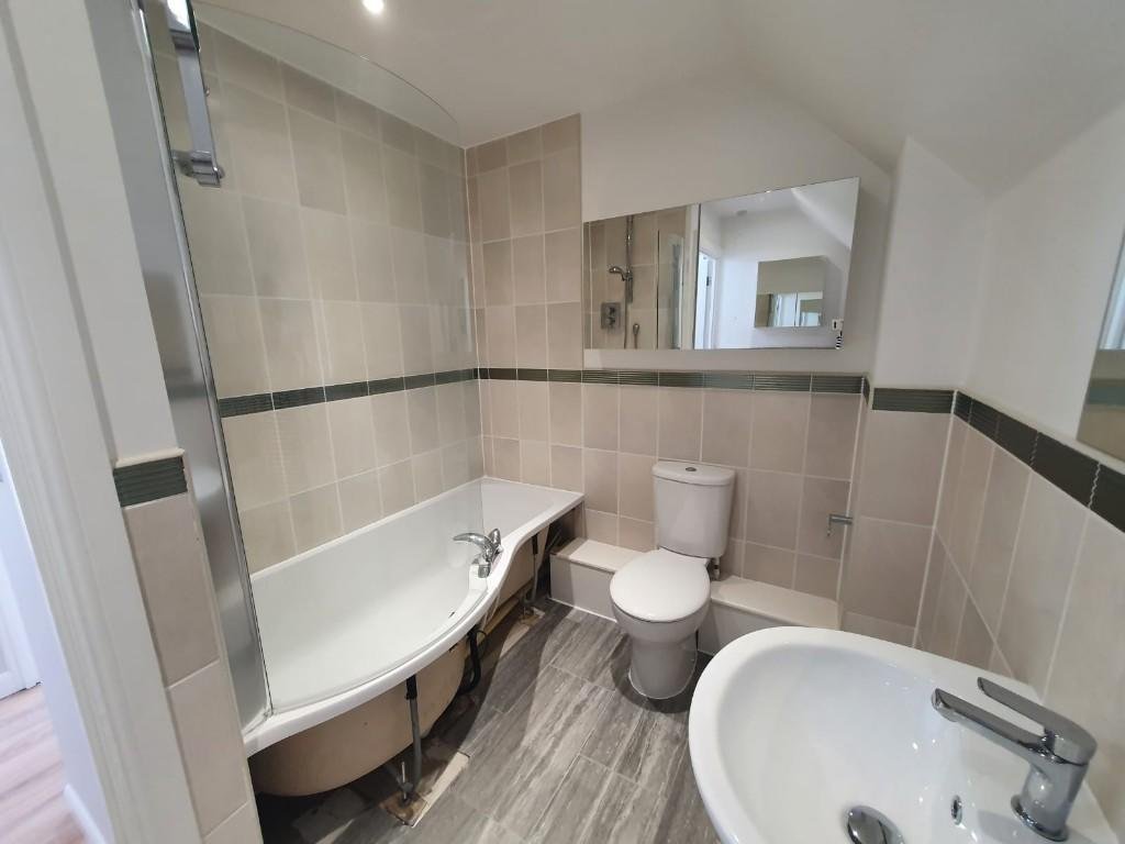 Fitted with three piece suite comprising bath with independent shower over and folding glass screen,