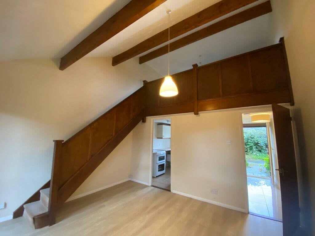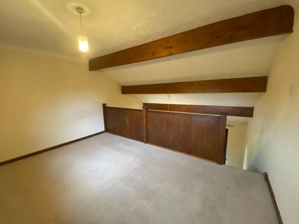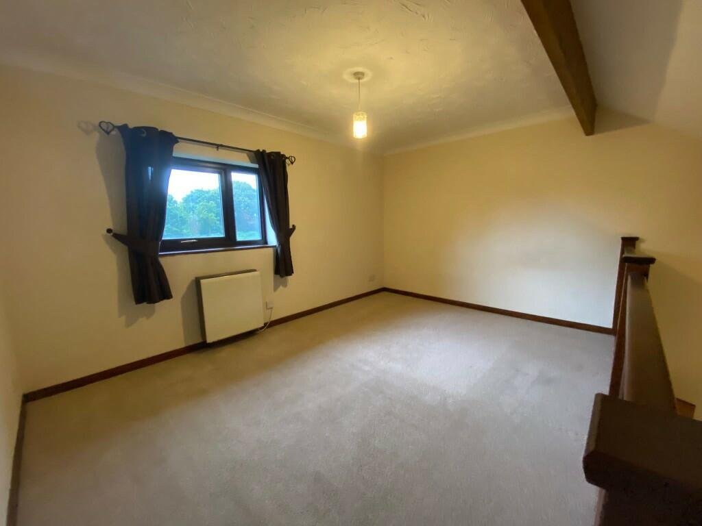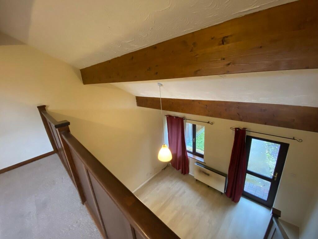 This unique and characterful property boasts a number of attractive features, including a striking mezzanine balcony overlooking the open-plan upper level and exposed wooden beams set within sloping ceilings. Set back from the road, the first-floor living area enjoys pleasant views across a surrounding wooded area, providing a peaceful and private setting.