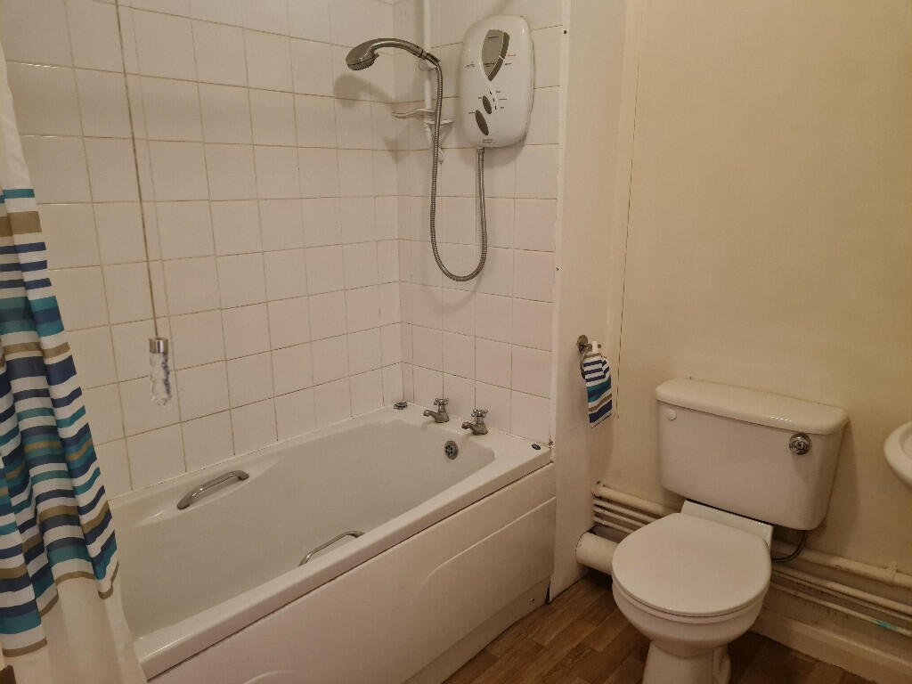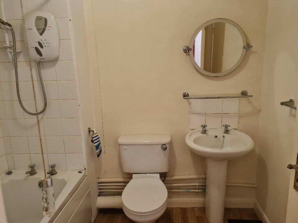 Bathroom: White suite comprising of toilet with push flush, basin with chrome taps, bath with chrome taps and electric wall mounted shower.  Walls are newly decorated in white and tiled to shower area.  Electric fan heater, extractor, mirror, shelf, towel ring and rail.  Oak effect laminate flooring.