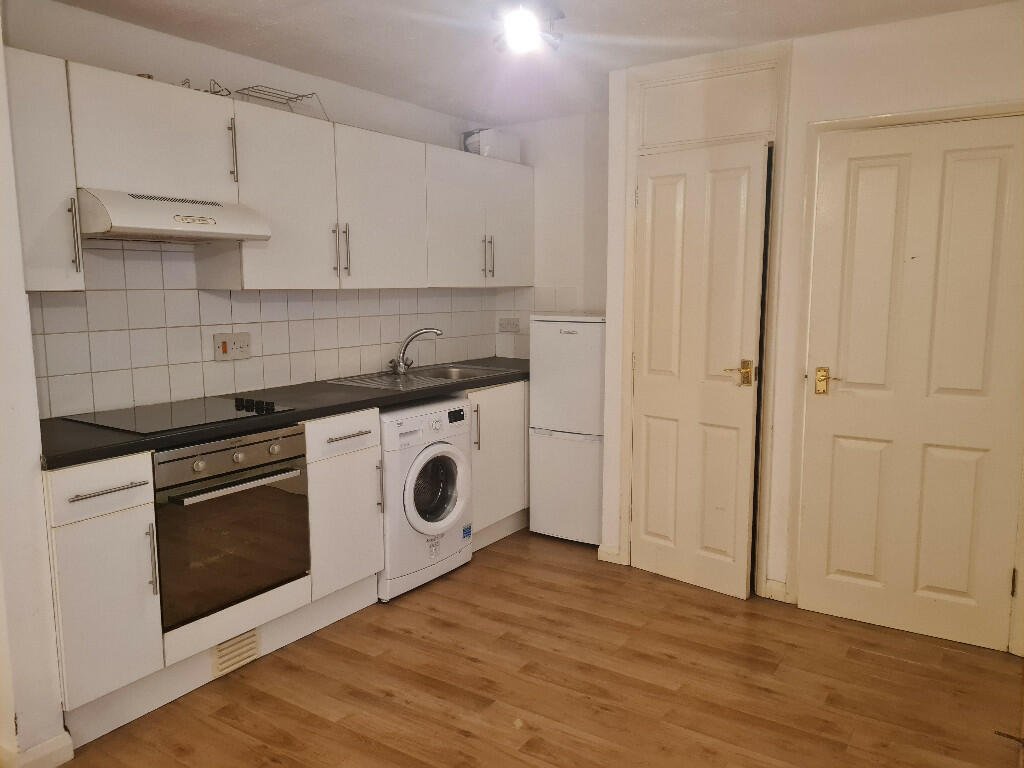 Kitchen area:  A range of white wall and base units with black granite effect worktop.  Indesit electric hob & oven, chrome sink, taps & drainer, Beko washing machine, LEC fridge freezer, extractor.  Cupboard housing the water heater.