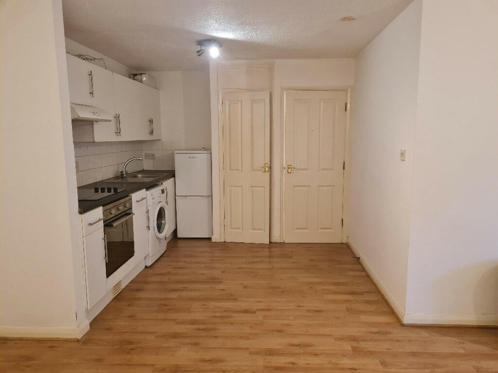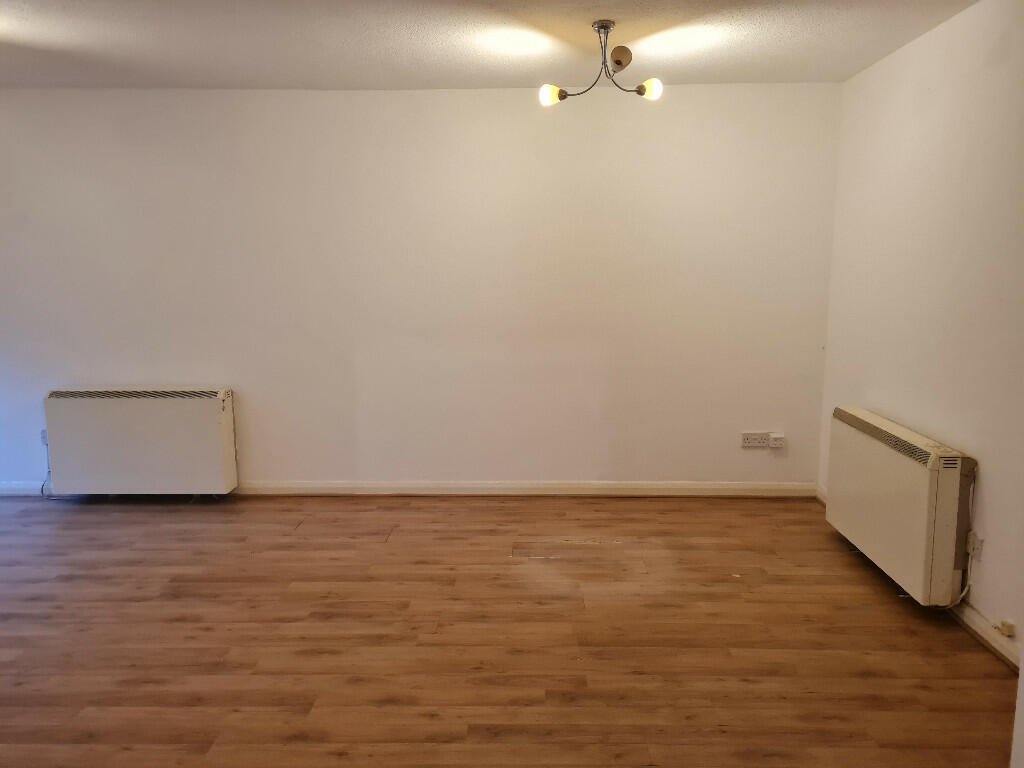 Living area:  Open plan with freshly painted white walls and oak effect laminate flooring.  Door leading outside to parking area.  2X electric heaters, TV aerial socket, open reach socket.