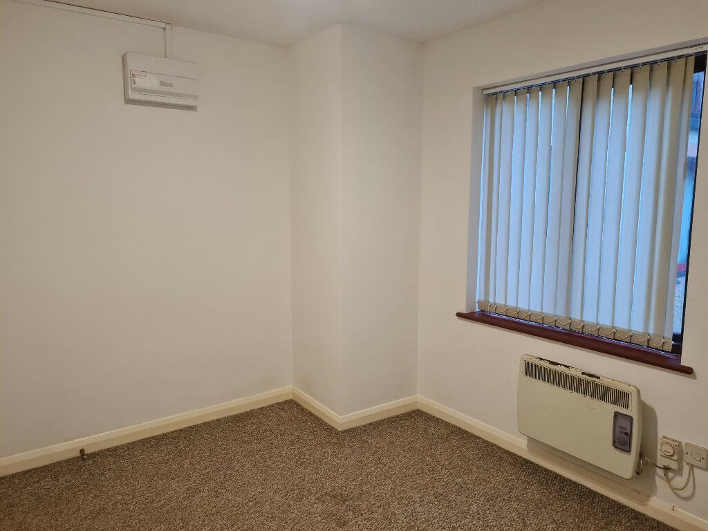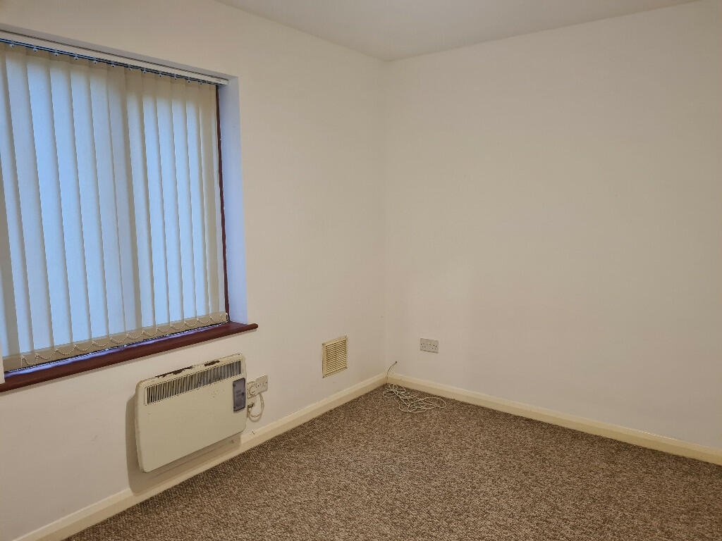 Bedroom: Double bedroom with newly painted white walls and neutral carpet.  Vertical blinds, spotlights & electric