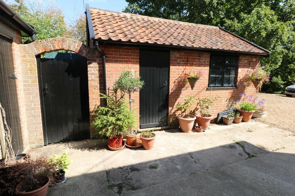 OUTSIDE The property benefits from a large wrap around garden with lots of established plants and trees, there is a good size patio to the rear of the property, to the front of the property there is driveway which has space to park several cars, there is also a garage and two outbuildings.