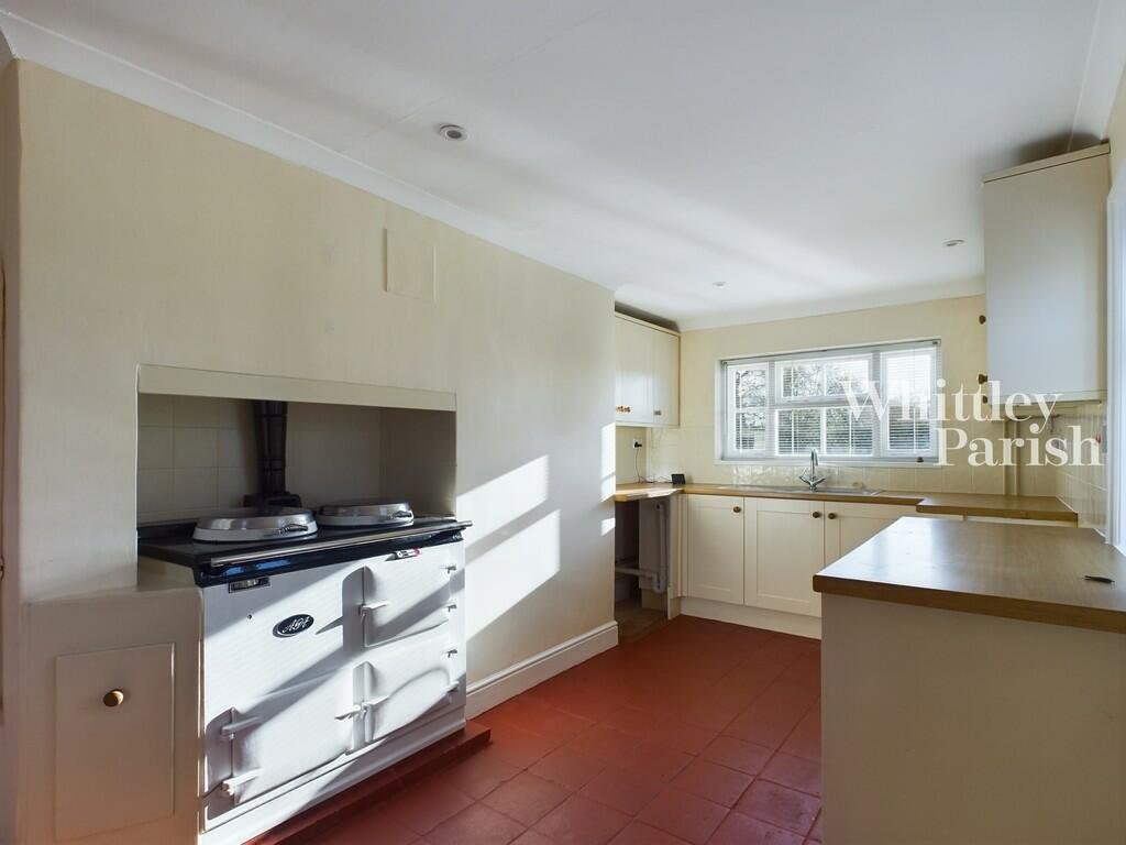 KITCHEN/DINER 22′ 4″ x 7′ 4″ (6.81m x 2.24m) Pamment tile flooring, Arga, lots of cream floor and wall units with wood effect worktop, stainless steel sink with drainer, space and plumbing for a dishwasher, space for a cooker and fridge freezer, space for a table, large understairs storage cupboard, halogen lighting, two rear aspect windows and a side aspect window.