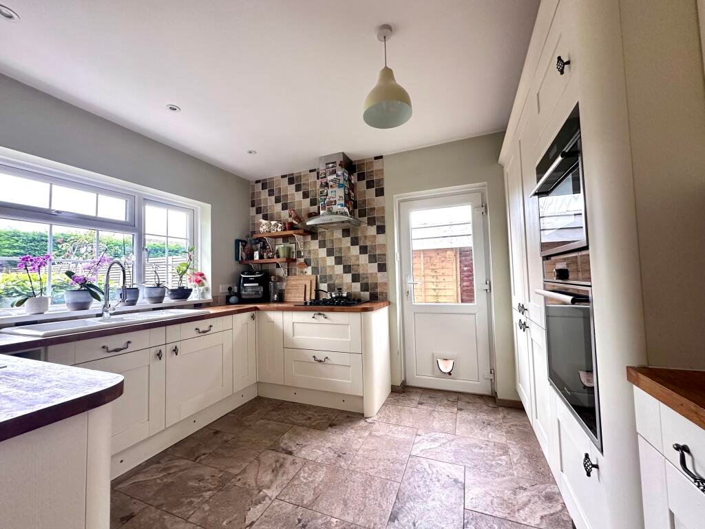 Double glazed window to rear aspect. Double glazed door to side aspect. Fitted with a range of base and drawer units with worksurfaces over and matching wall mounted cupboards. One and a half bowl ceramic sink unit with mixer tap. Built in fridge, dishwasher, Hotpoint oven. Four ring gas hob with extractor over. Ceramic tiled floor.