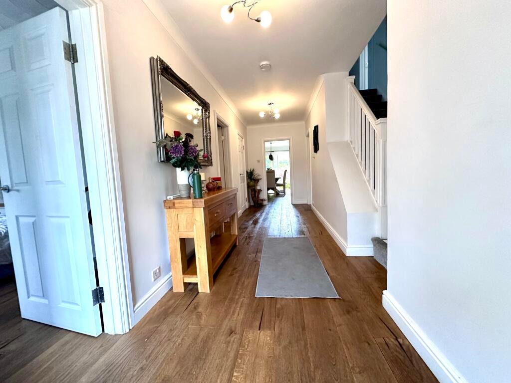 Front door, staircase rising to first floor, wood flooring, radiator. Built-in storage cupboard with shelving and hanging space.