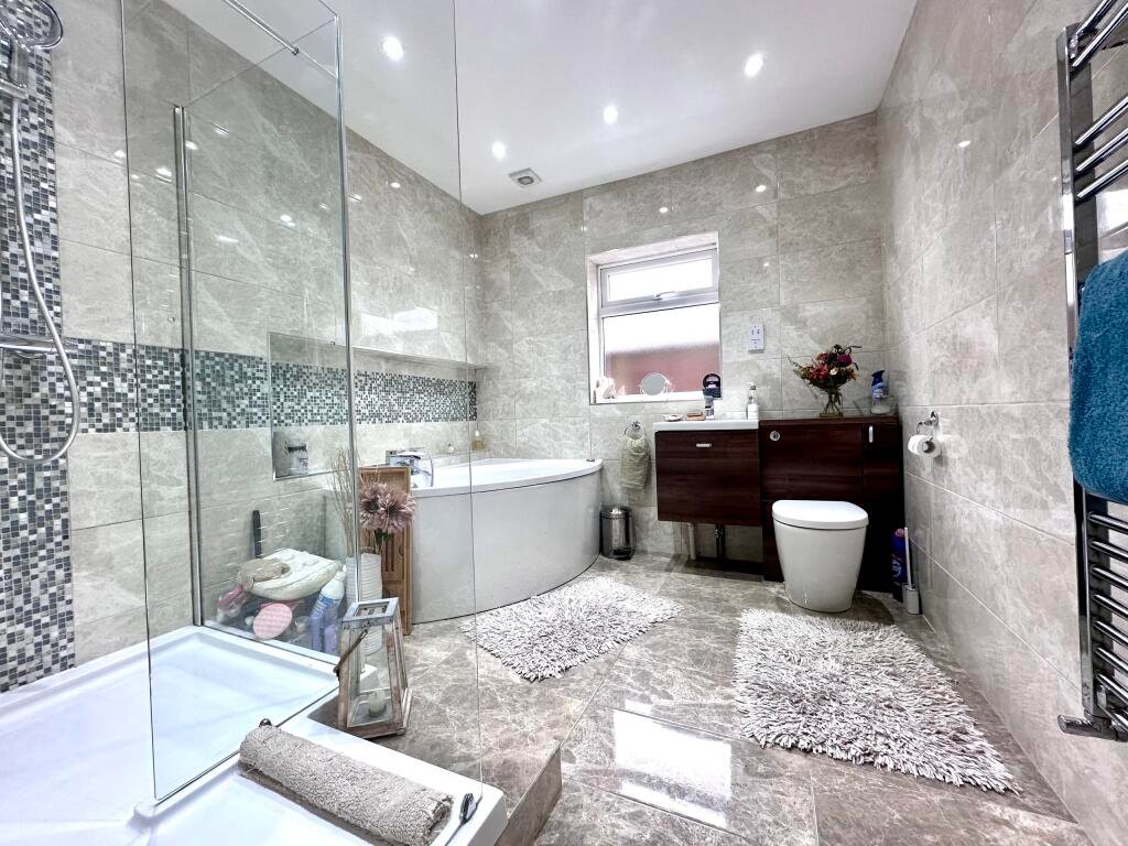 Comprising four piece suite with corner bath with jets, walk in double shower cubicle, vanity unit with inset washbasin. Low level WC, heated towel rail and ceramic tiled floor.