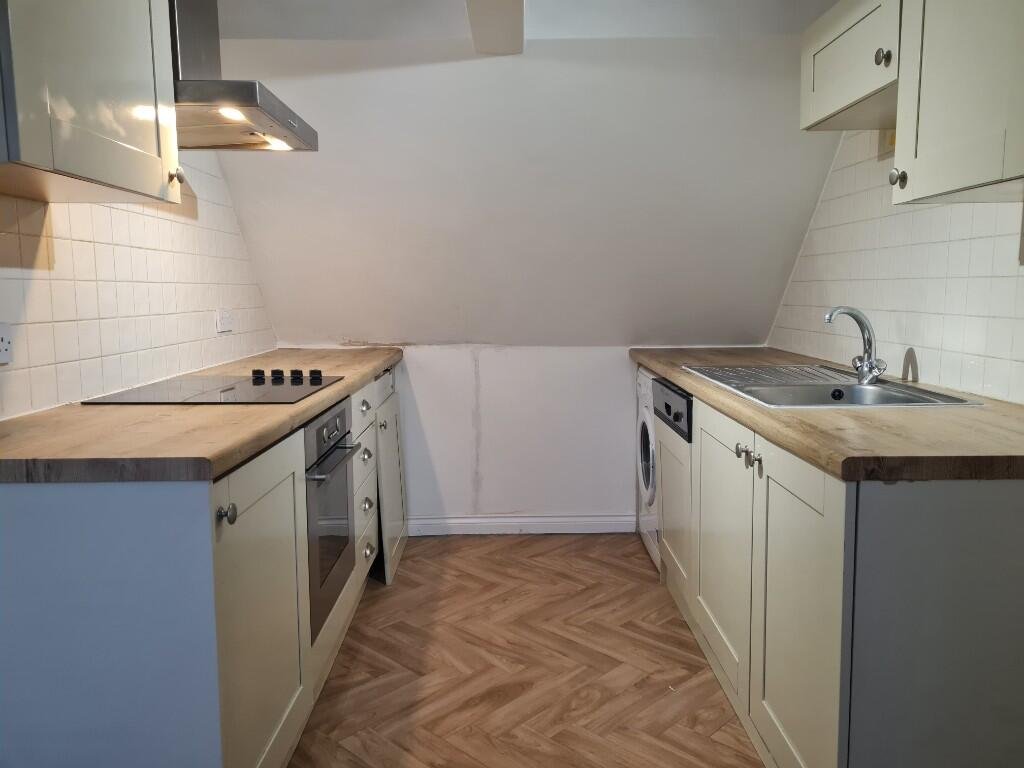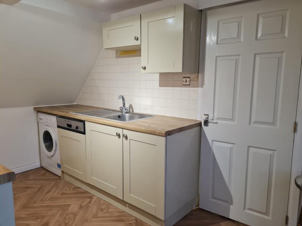 Kitchen: Cream shaker style base units with wood effect laminate worktop.  Integrated Indesit electric hob, Hotpoint electric oven, Hotpoint extractor, Bosch dishwasher, Beko washing machine and stainless steel sink/drainer with chrome mixer tap.  White walls and white tiled splashbacks.  Light wood effect vinyl flooring.  Cupboard housing the boiler. Sash window.
