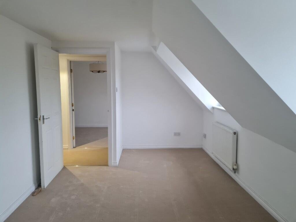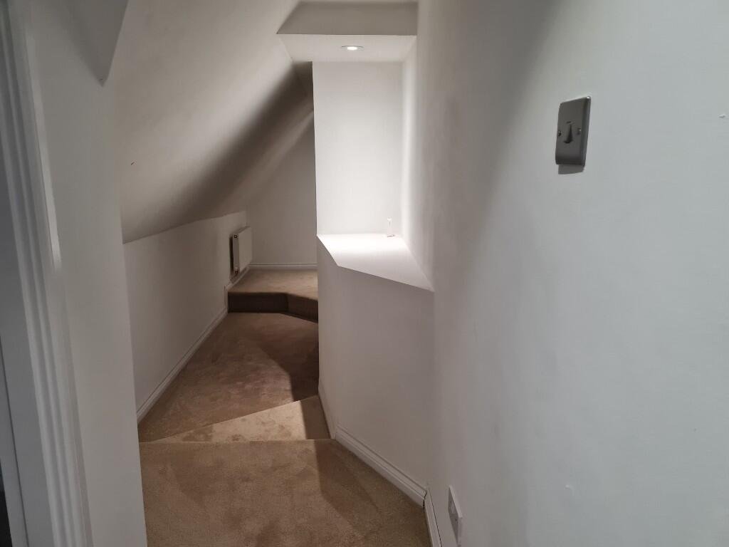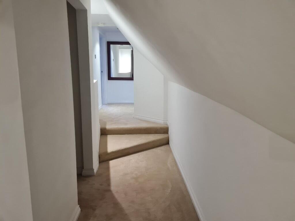 Entrance hall with slanted ceiling, white walls and beige carpet.  Leading to bedrooms, lounge, bathroom and kitchen.