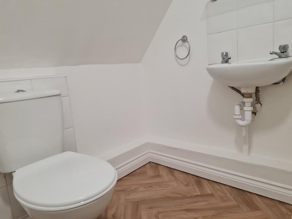 Bathroom: White suite comprising of close coupled toilet with push flush, basin with chrome taps.  Shower enclosure with Triton