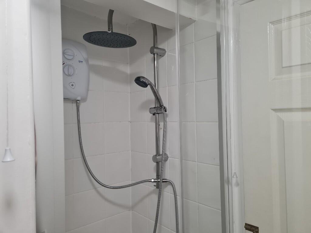 electric shower and waterfall head.  Mirror, extractor fan, shaver socket, toilet roll holder and towel ring.  Walls are white with white tiles to wet areas.  Wood effect vinyl flooring.