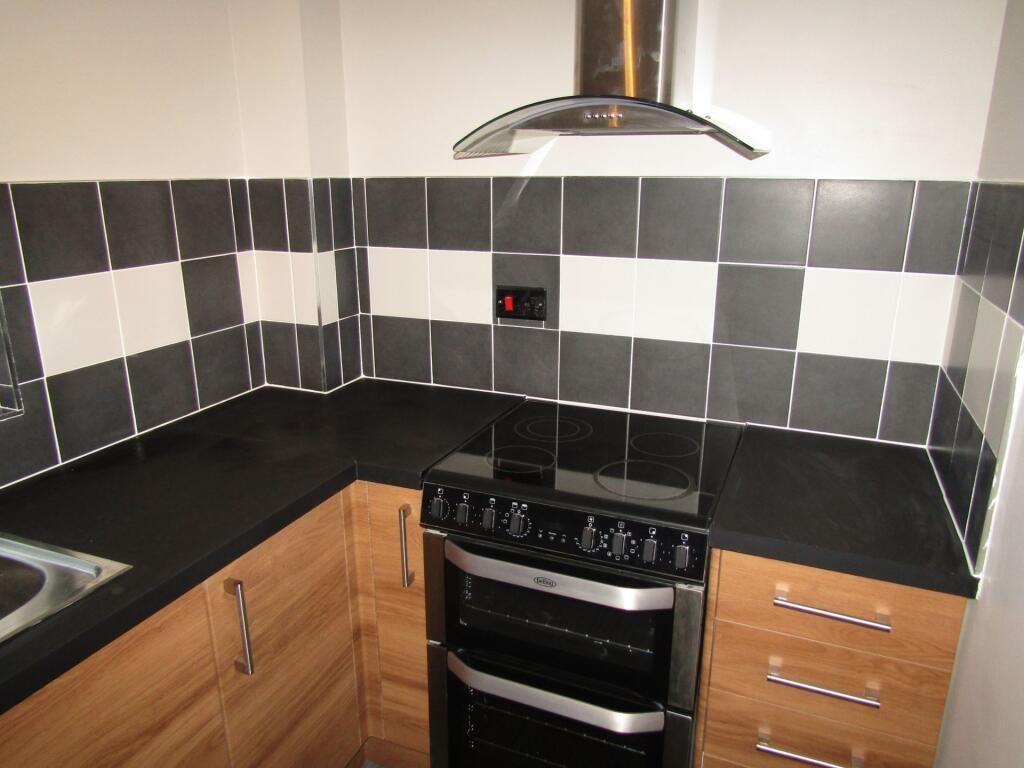 KITCHEN : 10’5″ x 5’10” (3.18m x 1.78m) , Brand new contemporary wood grain fitted kitchen comprising stainless steel sink & drainer with cupboard under, various base units with cupboards & drawers, eye level wall units, work surfaces & tiled surround, built in electric cooker with canopy extractor hood over, space & plumbing for washing macihine, space for fridge freezer, vinyl flooring, window to side aspect.