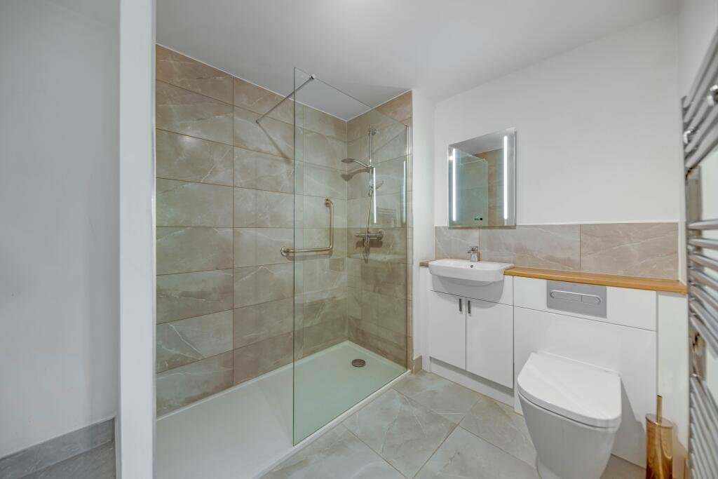 A fabulous two-bedroom apartment featuring a bright open-plan living/dining area leading to a separate modern kitchen. The master bedroom includes an en-suite with a double shower, a walk-in wardrobe, and a Juliette balcony. The versatile second bedroom could be used as a study, and there is an additional separate shower room for convenience. A handy storage cupboard in the hall completes the home, while the living room’s large window overlooks the High Street, offering a perfect spot to sit back and watch the world go by.