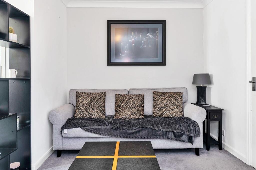 The lounge/dining room is wonderfully open-plan, with a window and double French doors to a dual aspect, a fireplace, integrated storage and shelving, carpets, pendant lighting, and ample space for a variety of lounge, dining and storage furniture.Â