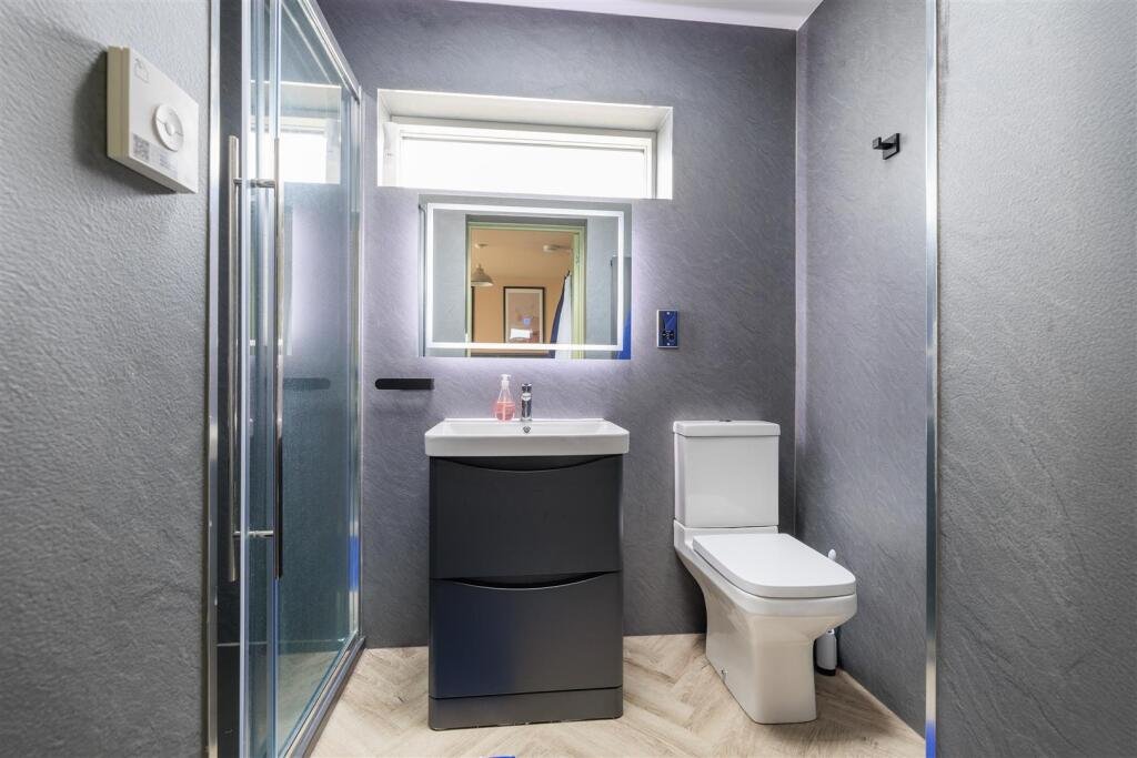 Ensuite – Window to side, Extractor fan, Wood effect flooring, Walk in shower cubicle, White HWB, White W/C