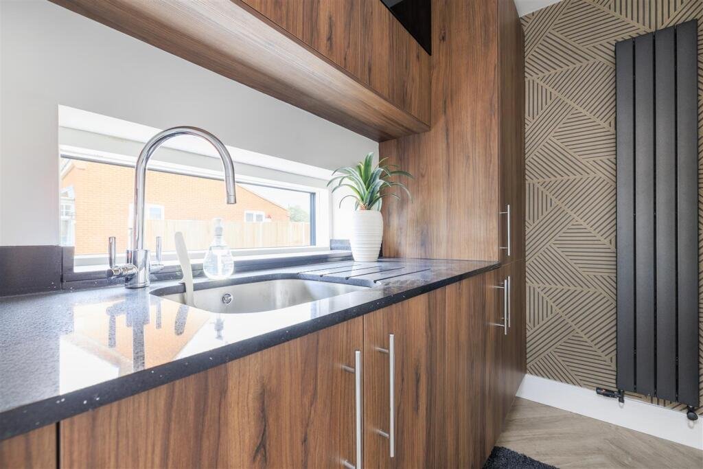 Utility Room – Window to side, Wood effect flooring, Radiator, Stainless steel sink, Wall mounted boiler, Washing machine, Various wall and base units