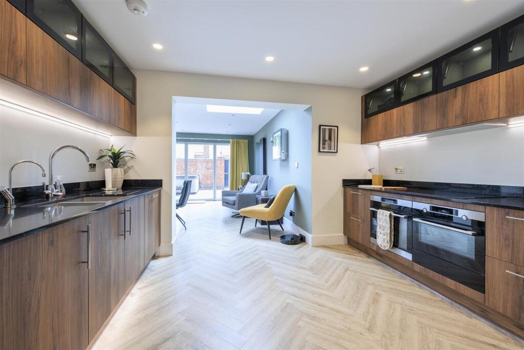 Kitchen – Wood effect flooring, Stainless steel double sink, AEG Induction hob, Double oven, Under counter fridge, Dishwasher, Various wall and base units