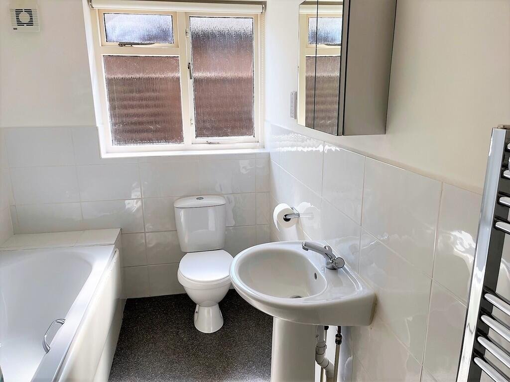 BATHROOM9’4″ x 5’9″ (2.84m x 1.75m)White suite. Panel enclosed bath with mixer tap shower attachment. Shower curtain. Low-level W.C. Pedestal wash hand basin. Part tiled walls. Vinyl floor. Chrome towel rail. Electric shaver point and medicine cabinet.