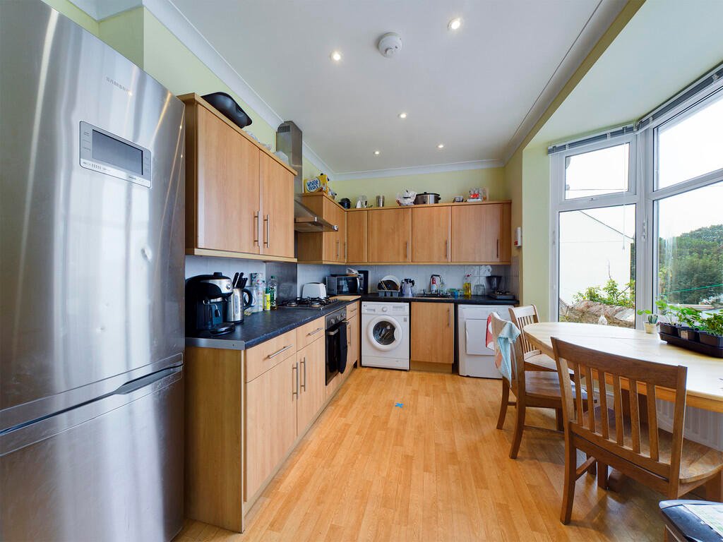 A short set of stairs descends to the large, well-equipped kitchen. The kitchen boasts ample wooden cabinets and dark worktops, providing both style and plenty of storage space. It comes complete with essential appliances, including a fridge-freezer, oven, gas hob, washing machine, and tumble dryer. There’s also a bay-windowed dining area with a table, offering a cosy space for shared meals.