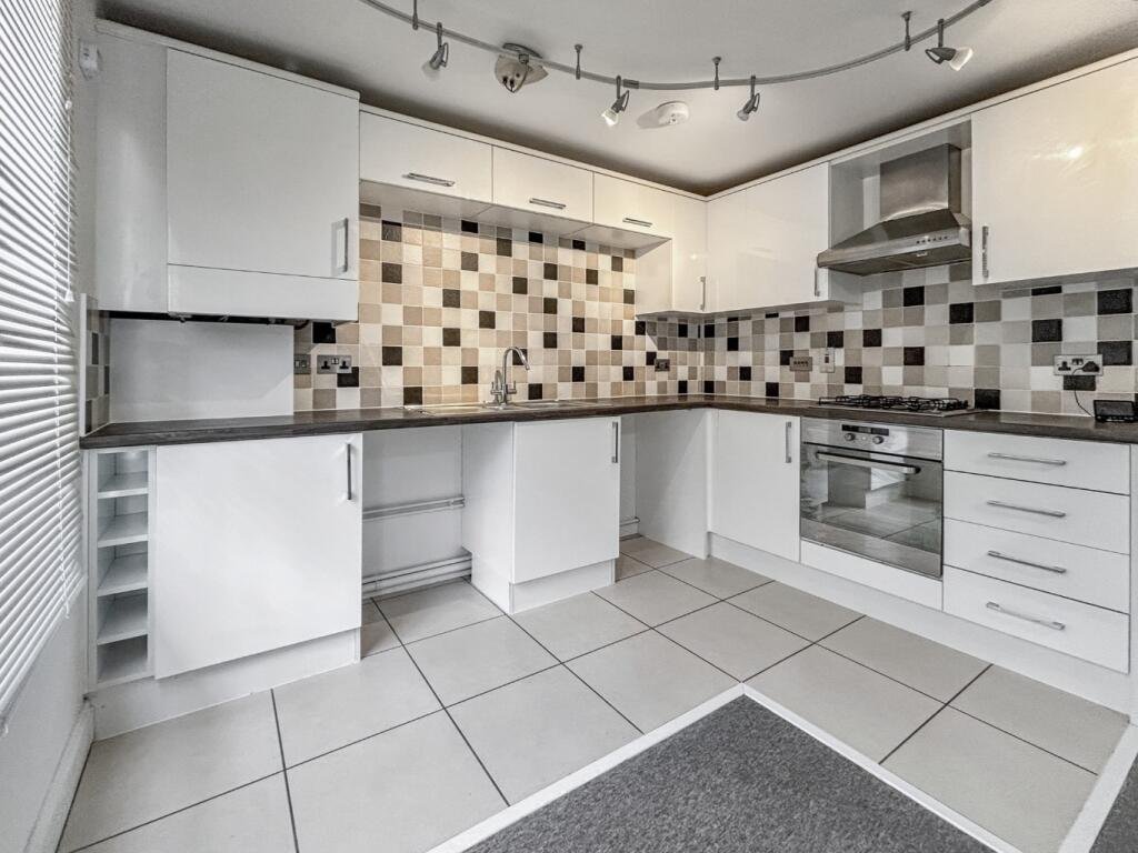 Fitted with a contemporary range of base and wall-mounted units, contrasting worktops and splashback tiling. Includes an electric oven and gas hob.