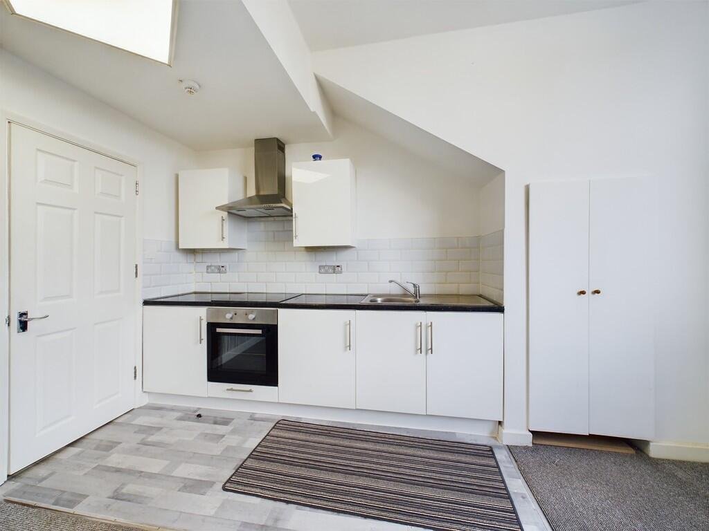 As you enter the property, there is a small inner hallway with stairs taking you through the open-plan kitchen-lounge which benefits from ample light with large window. The kitchen has been fitted with modern white cabinets allowing plenty of space for storage and finished with dark worktops and white tiles. There is space for a washing machine, but the property is supplied with an electric hob and oven.