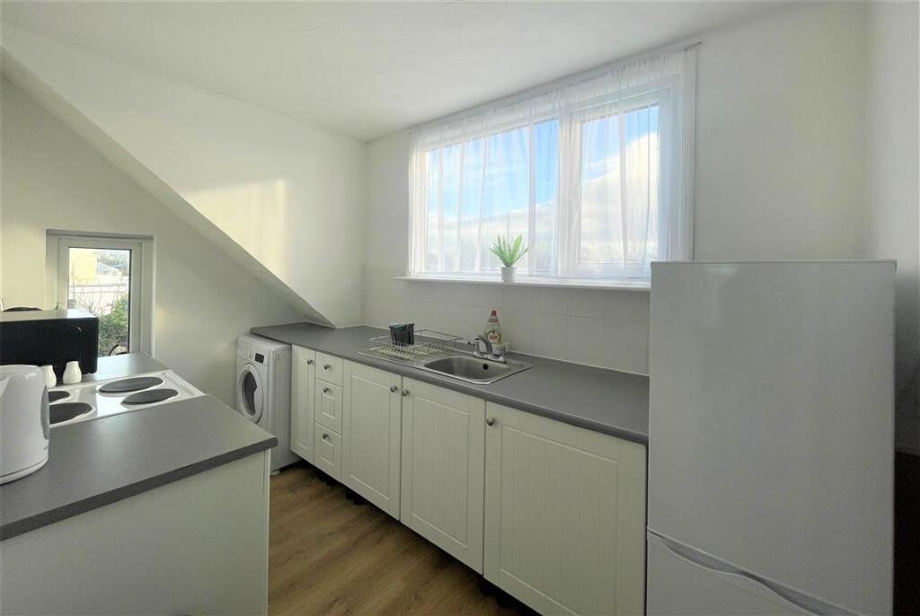 Leading off from the studio room is the good size modern kitchen with all white goods, appliances and crockery etc.