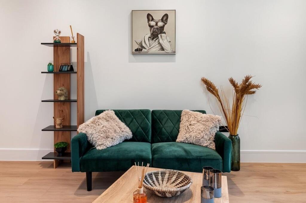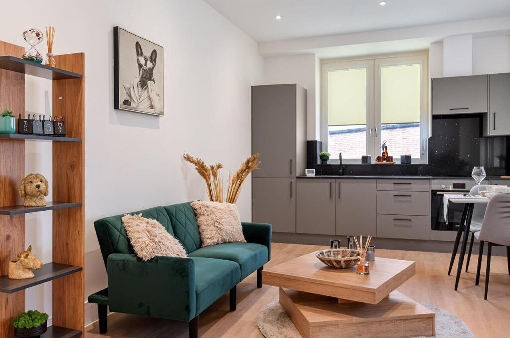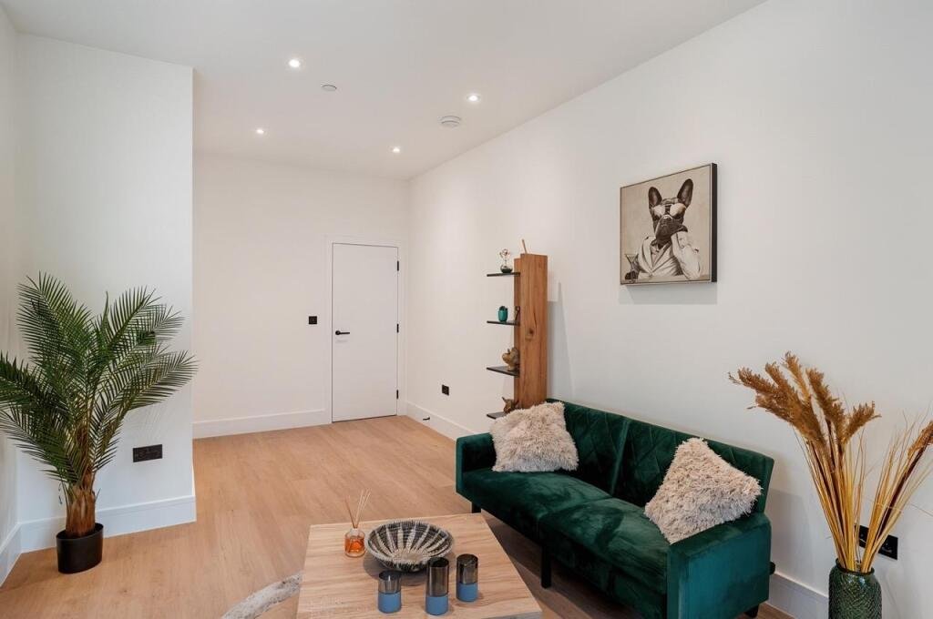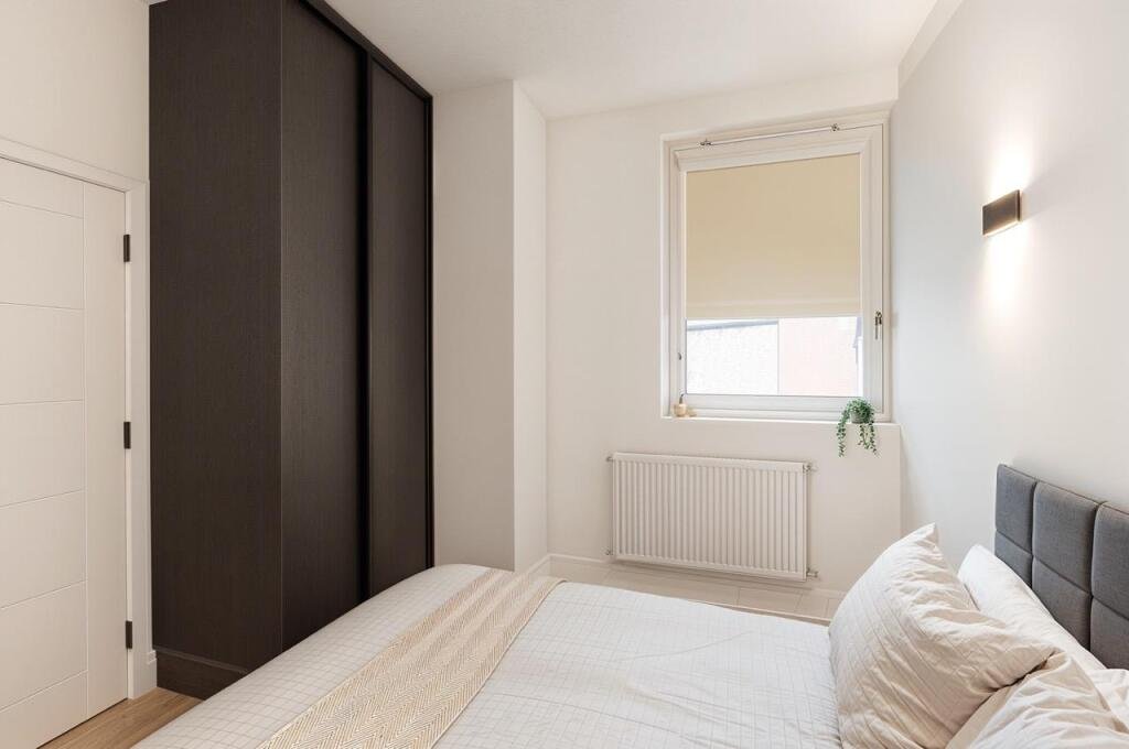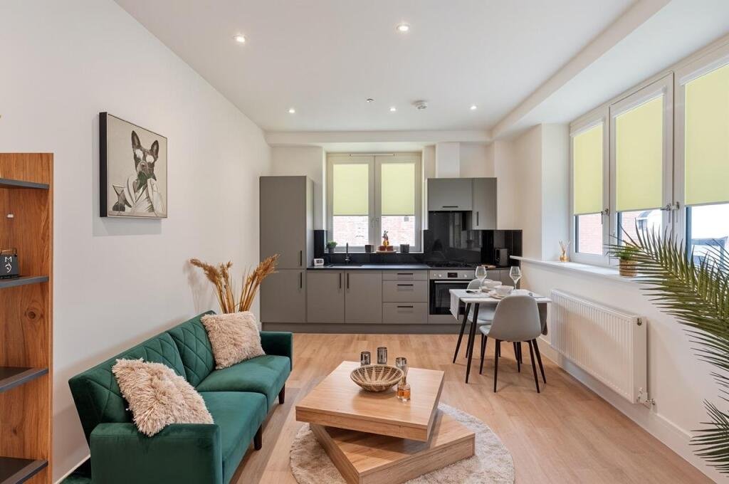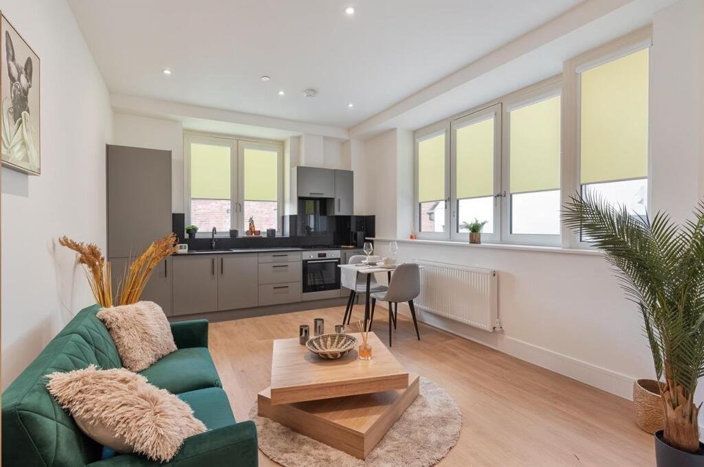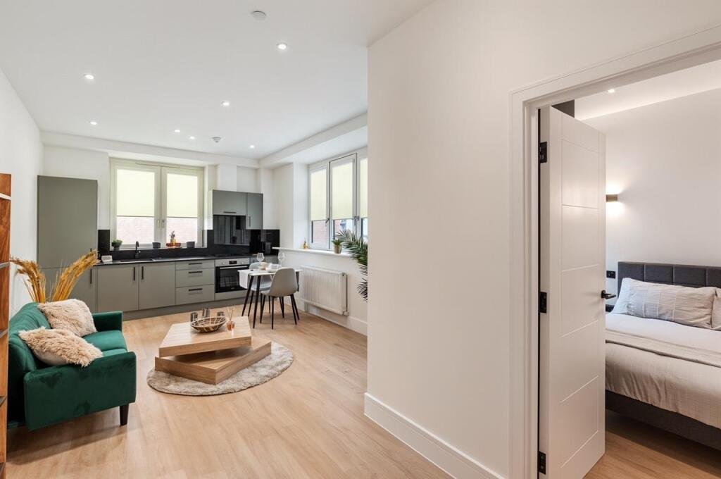 Each apartment features an open plan living area with engineered wood flooring, a sleek kitchen equipped with Bosch appliances, and a double bedroom complete with a fitted wardrobe. The modern family bathroom and additional storage cupboard enhance the functionality of the space. An