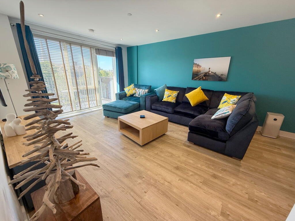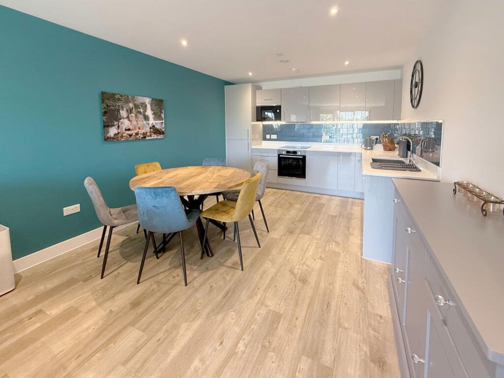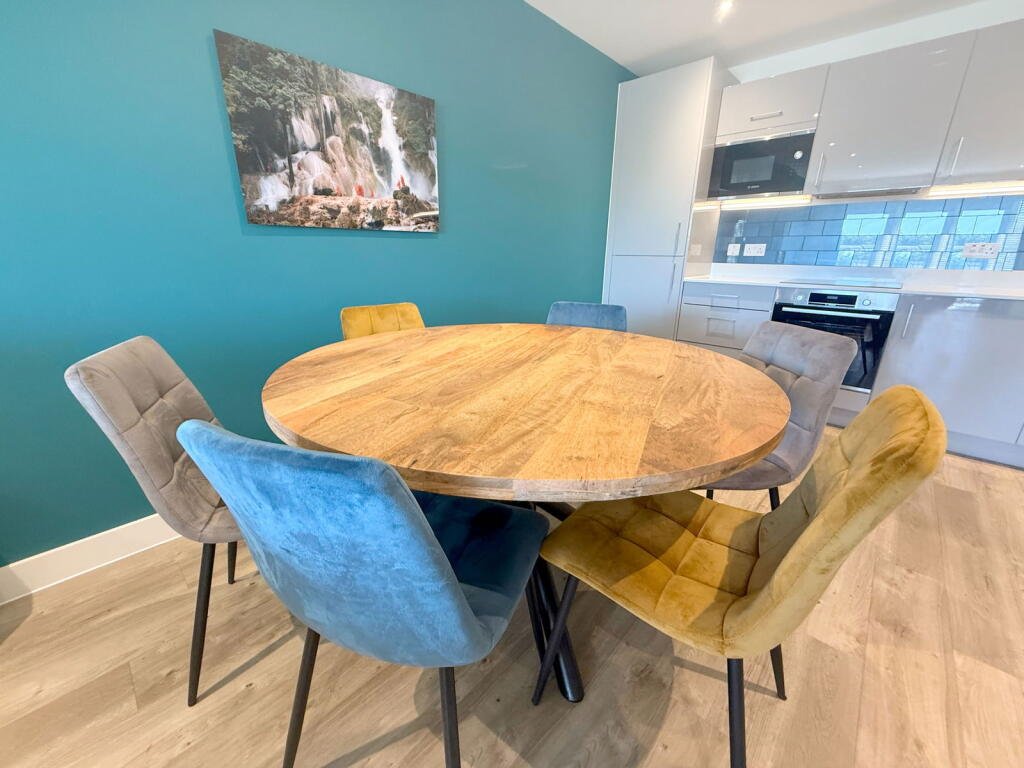 the generous open-plan living space, thoughtfully designed for both comfort and style. A spacious lounge and dining area flow seamlessly into a modern fitted kitchen with integrated appliances and ample storage. From here, tenants can step onto a private balcony, perfect for morning coffee or evening relaxation while taking in the tranquil waterside outlook.