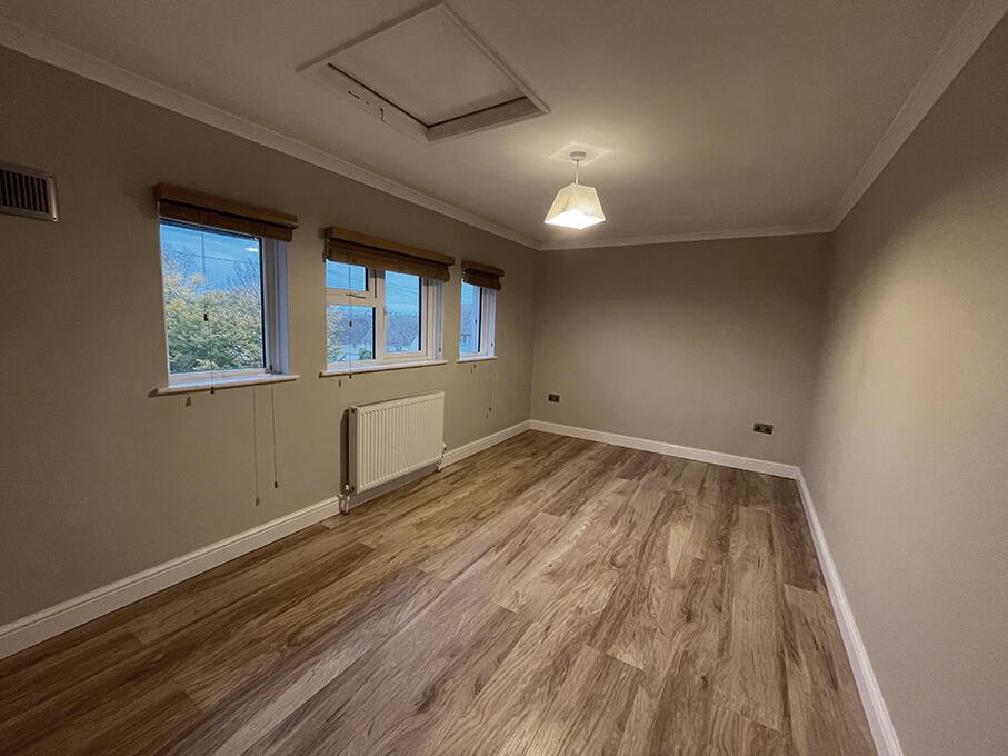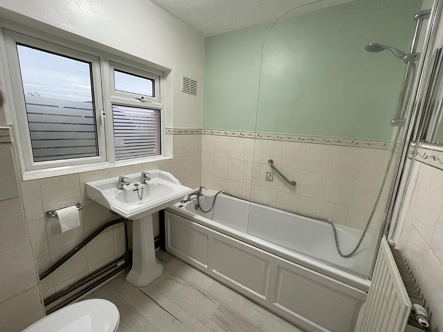 Upstairs, the property offers three double bedrooms, two of which are exceptionally spacious. The family bathroom is well-appointed with a bath and overhead shower, glass screen, WC, and basin.