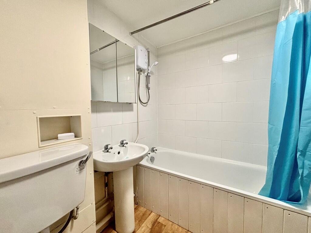 Bathroom White 3 piece suite comprising panelled bath with tiled surround, and electric shower over, low level wc and pedestal wash basin, chrome ladder radiator, fitted vinyl flooring, extractor fan.Â