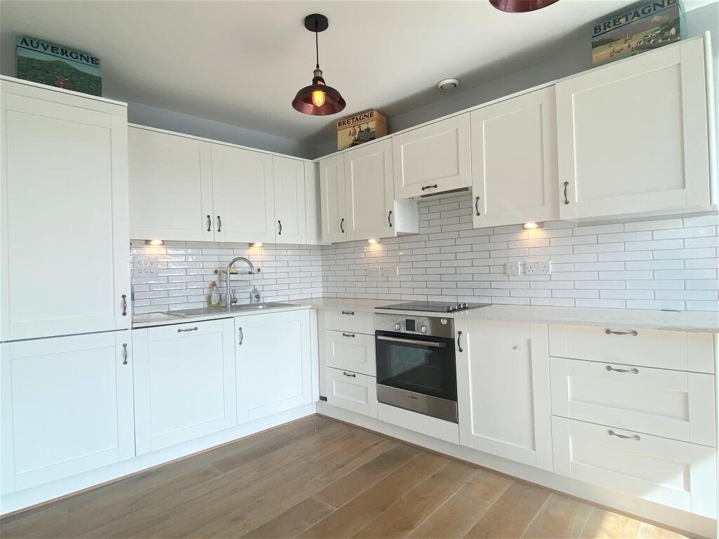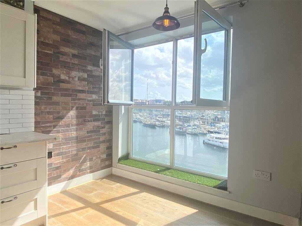 Kitchen/Living space180 degree view of the Marina with Juliette balcony. Kitchen contains roll top work surface with a range of base and eye level wall units. Integrated stainless steel sink & drainer with mixer taps. The fitted appliances include electric oven and ceramic hob with extractor hood over, integrated fridge freezer and dishwasher. Tiled back splash back to the units and down light under the wall units. Wood style flooring throughout.