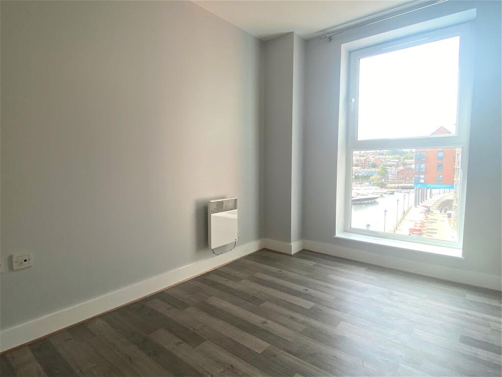 Bedroom OneSide aspect window with marina views, door to en-suite shower room and wood style flooring.