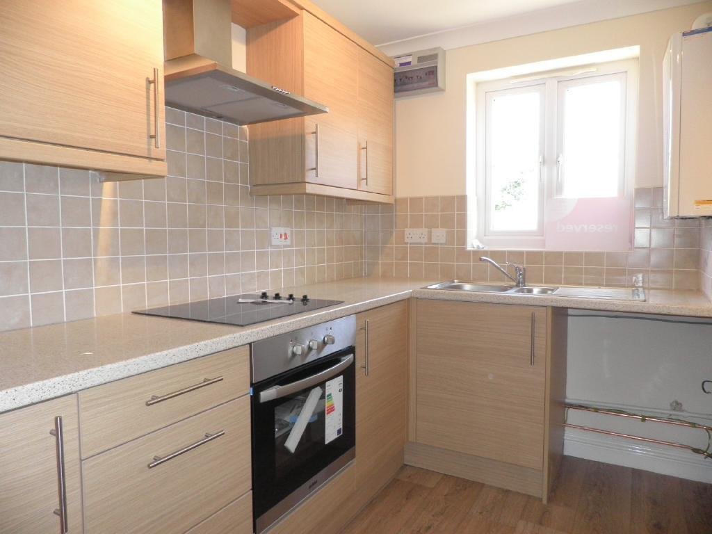 KITCHEN – Window to front, radiator, range of fitted wall and base units, stainless steel one and a half bowl sink and drainer, built-in stainless steel electric oven and hob with extractor hood over, space and plumbing for washing machine