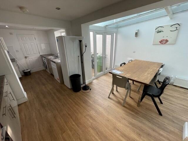 The property benefits from a large open-plan kitchen/diner with generous worktop space and a dining suite, with a walkthrough to a seperate lounge with sofas and a rear door leading to the enclosed rear garden with large decking. The 6 double bedrooms have the shared use of 3 shower rooms, and are furnished with bedframe and mattress, along with clothes storage units, a desk and a chair.