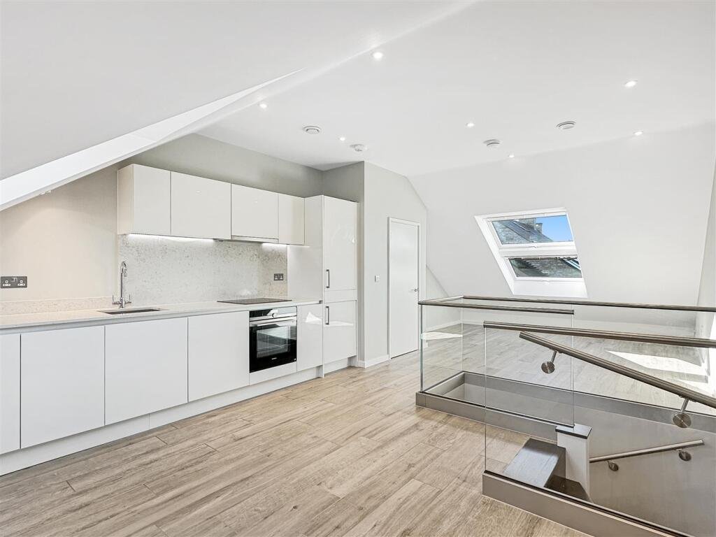 Kitchen/Living/Dining Room – 9.01 x 4.13m (29’6″ x 13’6″) – First floor cleverly designed open plan area with central balustrade for living and dining and kitchen area with electric induction hob and electric oven, fridge freezer, washer-drier and slimline dishwasher