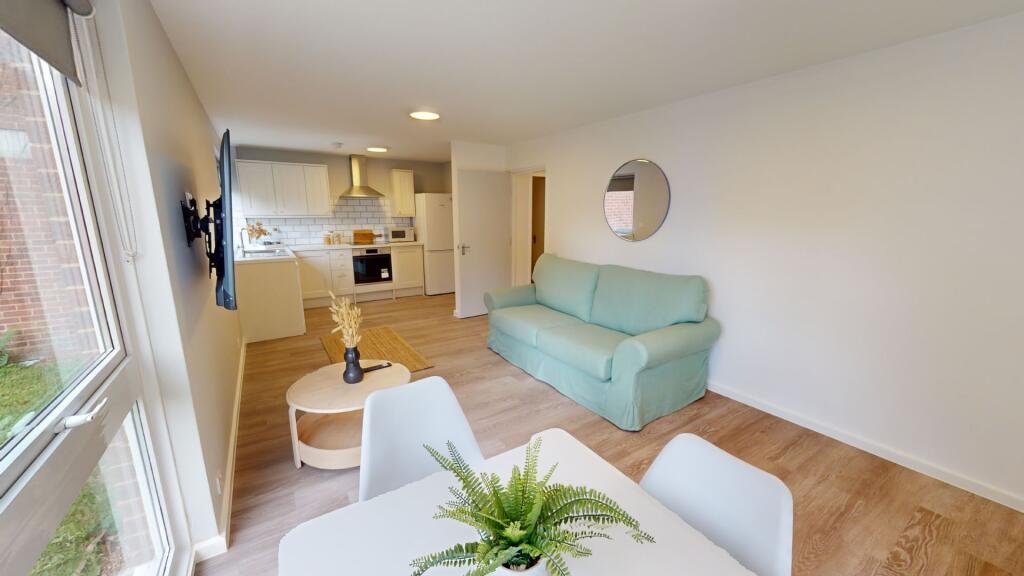 We’ve refreshed the interior with student living in mind.The bedroom offers a double bed, desk, and internal storage with a built-in wardrobe. Loaf on the sofa and watch Netflix on your huge Smart TV! Forget about doing the dishes, and instead, just remember to unload your dishwasher. Don’t feel like cooking? No problem! The central location means even the fussiest eaters can find their new favourite takeout on Deliveroo. Both bath and shower lovers will be appeased as the bathroom offers a tub with an overhead shower.