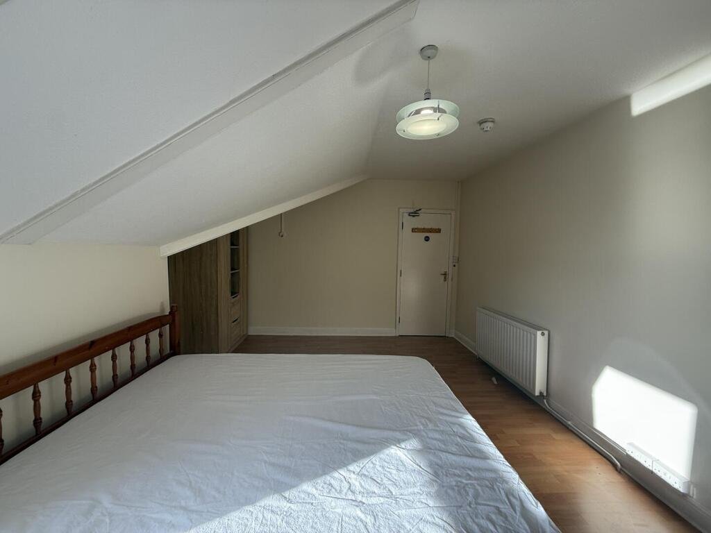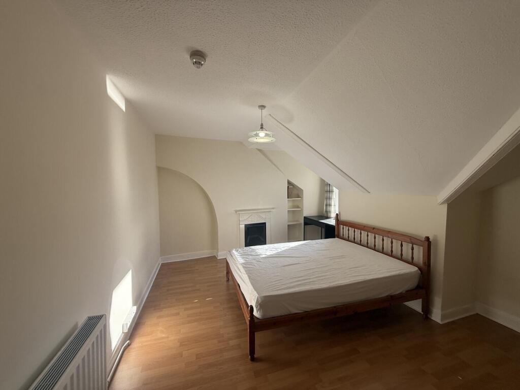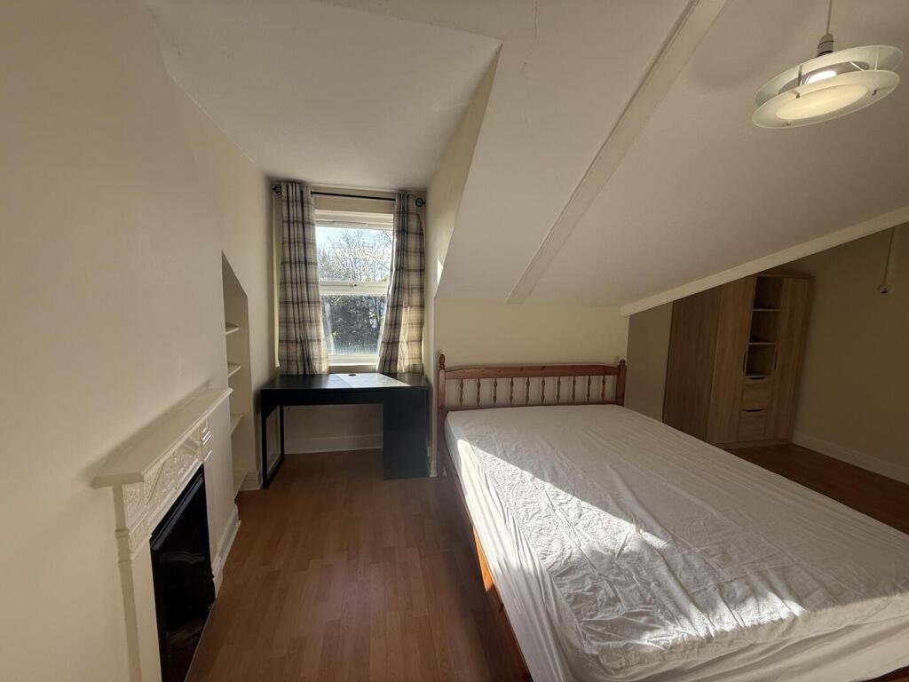Room 3 – 5.07 x 3.85 (16’7″ x 12’7″) – An inviting south-facing double bedroom located on the second floor, showcasing charming sloping ceilings. The room is fully furnished with a comfortable double bed and mattress, a wardrobe, a chest of drawers, a desk, and a bedside cabinet—ready for immediate occupancy. It is an excellent choice for mature students or professionals seeking a cozy and well-maintained living space.