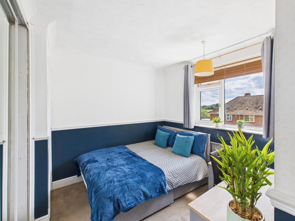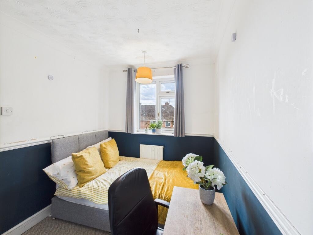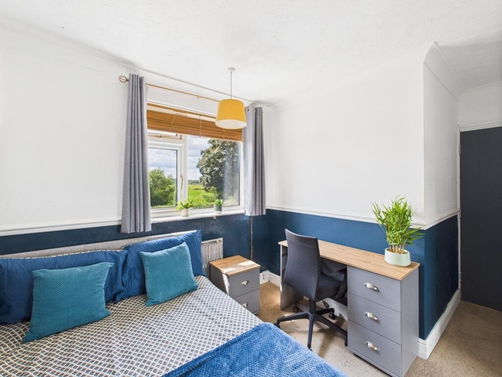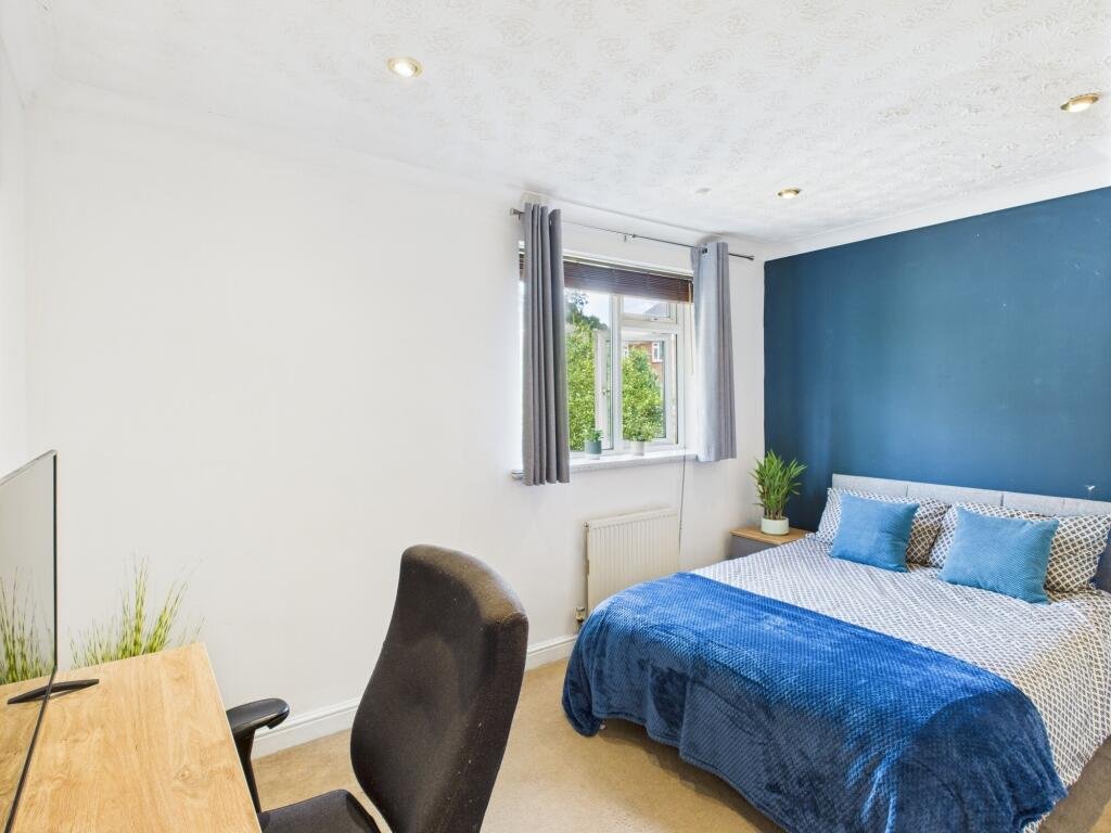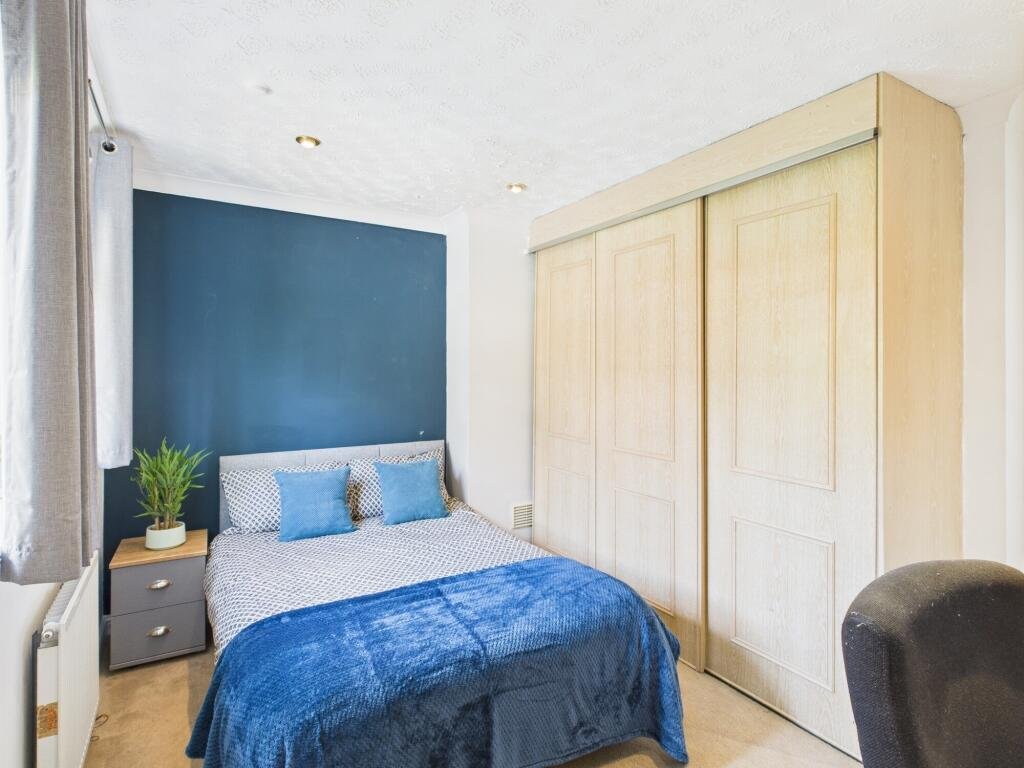 Upstairs bedroom 3Â – Overlooking back garden, large built-in mirrored wardrobe, chest of draws, double bed, desk, chair