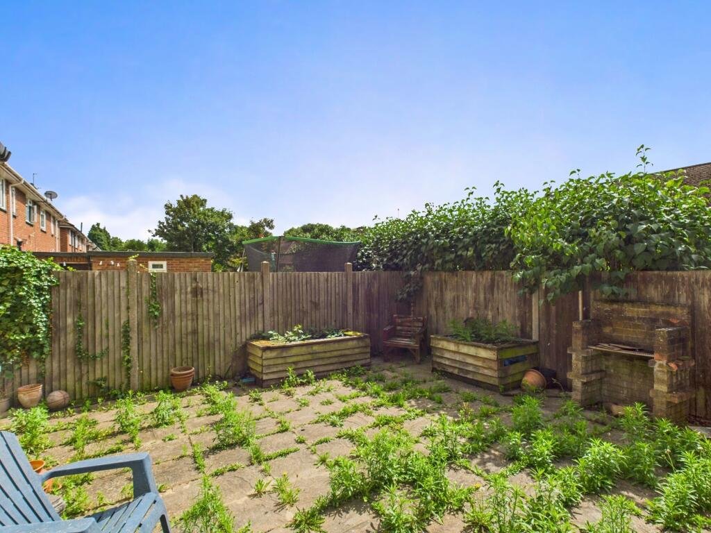 Back Garden – laid with patio, fence for privacy, brick BBQ and garden chairs