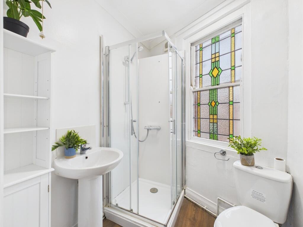 Bathroom – With shower, basin, toilet and bathroom cabinet.