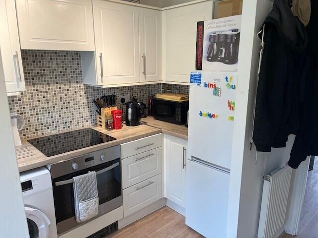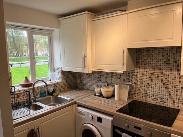 KitchenModern eye and base level units, integrated gas hob and fan oven. Space for washing machine and tall fridge freezer. Window to front aspect.