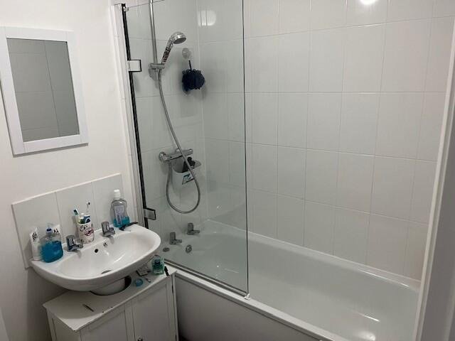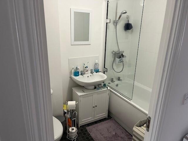 BathroomThree piece suite consisting of WC, basin and bath with shower overhead.