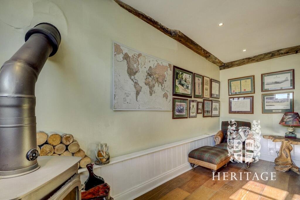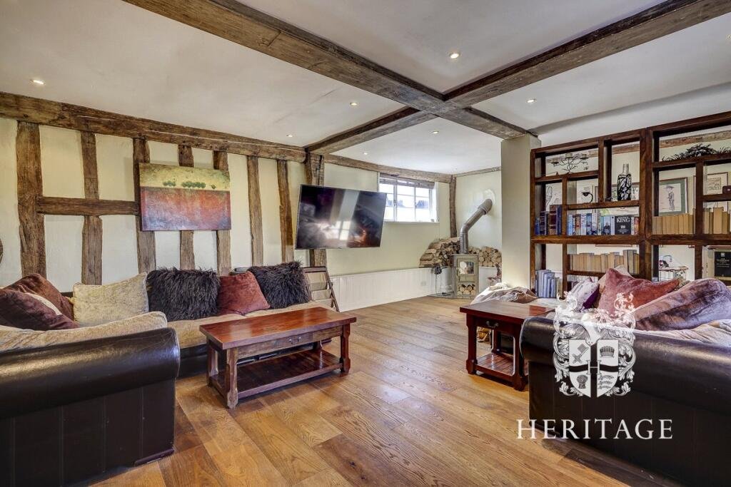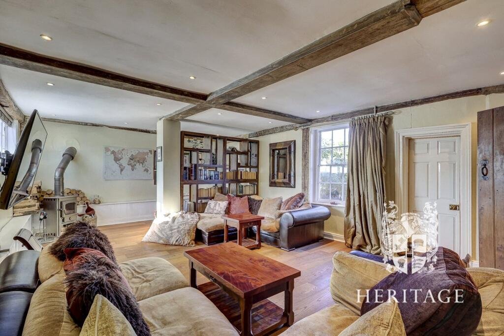 The sitting room is a generous living space featuring wood flooring, exposed beams, and a wood-burning stove, creating a wonderfully cosy atmosphere.