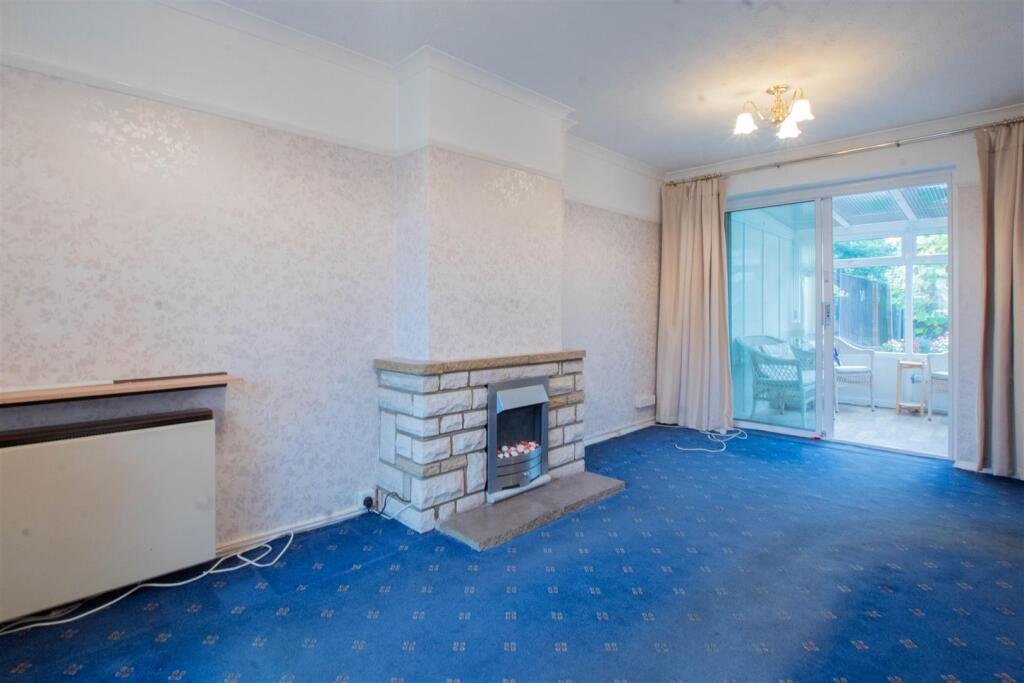 Lounge – 5.41m x 3.02m (17’8″ x 9’10”) – Window to front, feature fireplace, door to kitchen, sliding doors to: