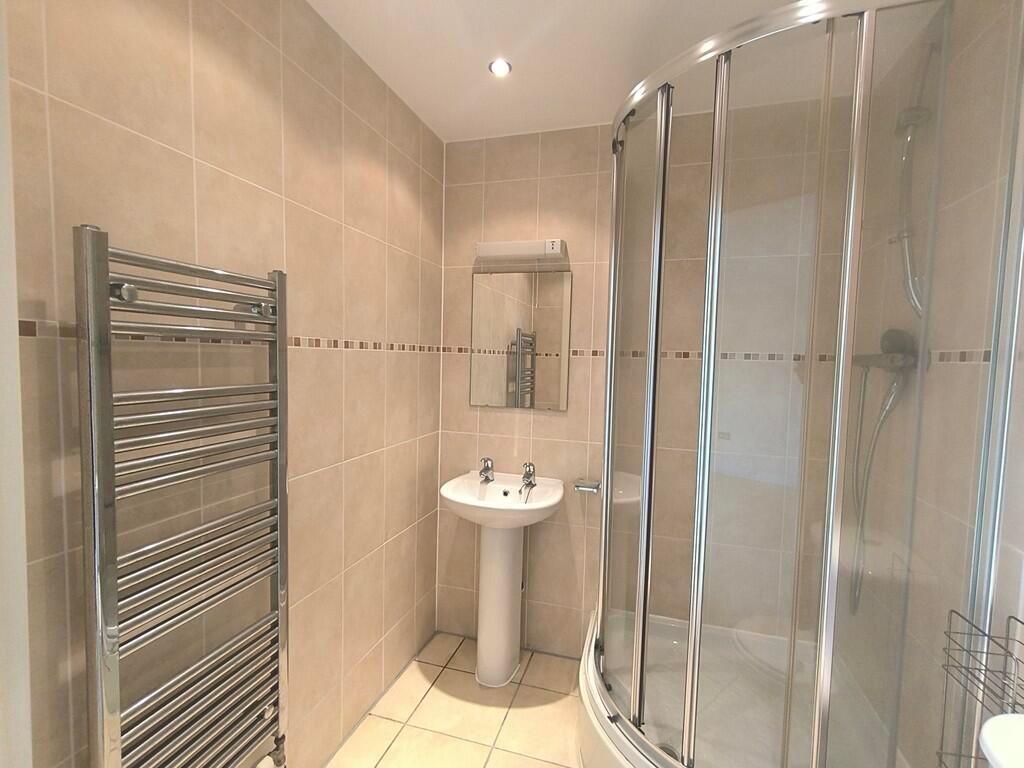 En-Suite Shower Room Length(m):1.68 X Width(m):1.65 ,Area(m):2.77 White suite comprising corner shower cubicle, low-level WC and pedestal hand basin, coved ceiling, ceramic tile floor, ceramic tile walls, inset ceiling lights, extractor fan, chrome ladder radiator.Â