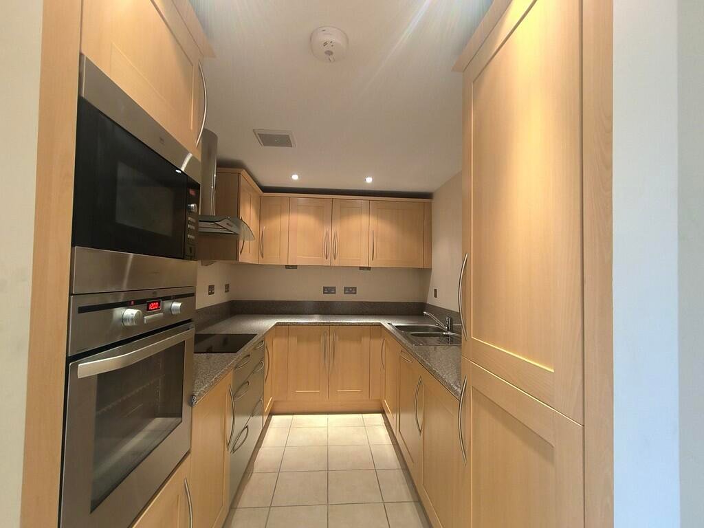 Kitchen Length(m):3.28 X Width(m):2.18 ,Area(m):7.15 Stainless steel 1.5 bowl sink unit with chrome mixer tap, inset to laminate roll-edged worktop and fitted with light timber-effect units comprising base units, drawer chest and wall-mounted cupboards, integrated fridge/freezer, built-in electric oven, microwave, 4-ring touch-control ceramic hob with chimney style extractor above, ceramic tile floor, inset ceiling lighting and extractor fan.Â