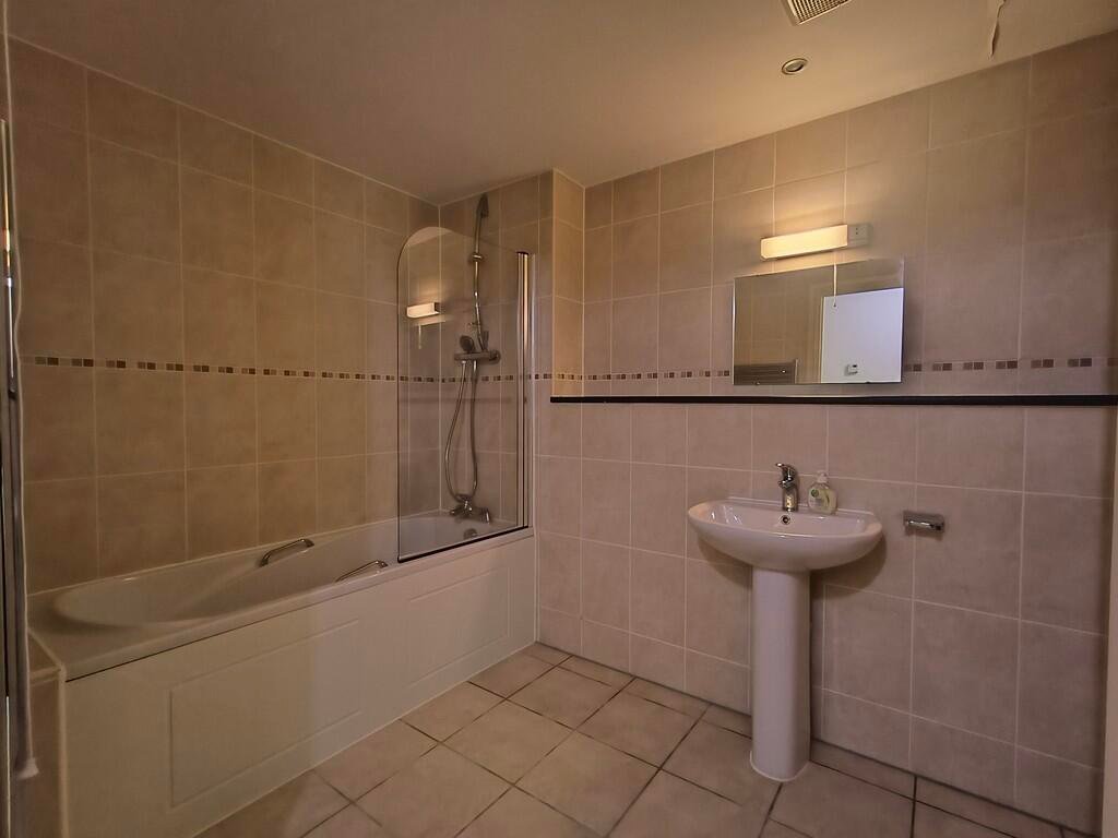 Bathroom White suite comprising twin-grip panelled bath with chrome mixer tap and shower over, with hunged glazed screen, pedestal hand basin and low-level WC, ceramic tile floor, inset ceiling lights, extractor fan.Â